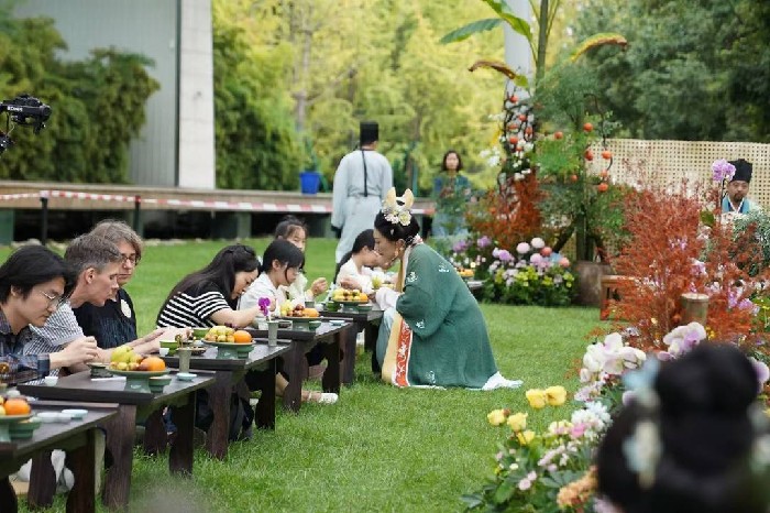而在成都金沙遗址博物馆中,正带领观众“穿越”至一千年前的中秋佳节。依托馆内正在举办的“青·韵——文物里的中国传统色彩美学”特展,现场特别复原了宋代中秋雅集的雅致盛景。于是,在国家考古遗址公园的自然之美中,现场游客通过簪花、净手、品茗、焚香、听琴、诵诗、制香等环节,在一器一物、一茶一香中感受宋代文人的生活美学。